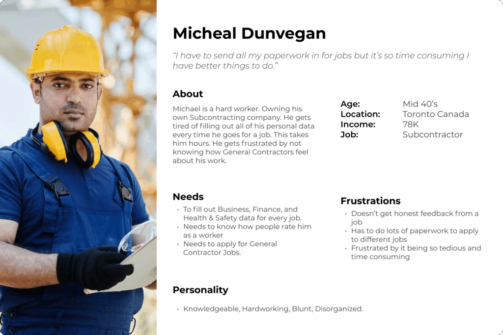 Discovery & Scoping: Leveraging existing GC and Subcontractor personas, we aligned with the PO on project goals, MVP scope, and addressed potential issues like managing negative reviews. We framed our challenge with “How Might We” questions to improve GC access to performance data and help Subcontractors showcase their work.